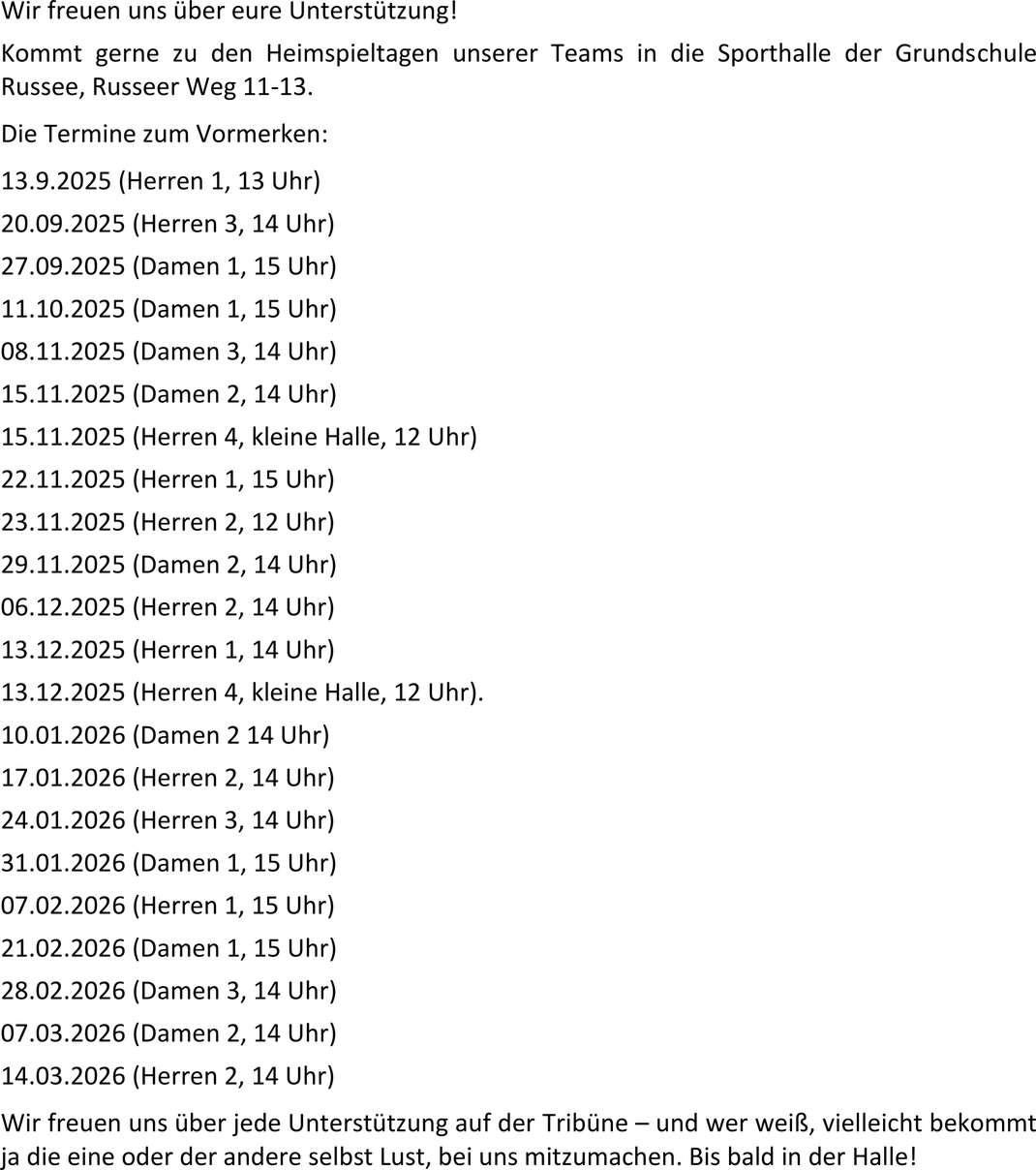 Für Anfragen und weitere Informationen erreicht man die Abteilungsleitung und alle Teams über die E-Mail-Adresse tsvrussee.volleyball@outlook.de